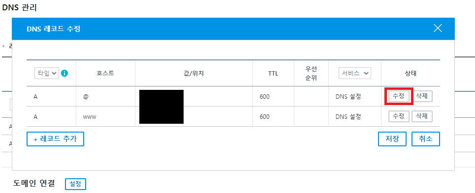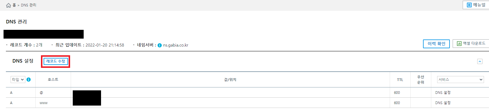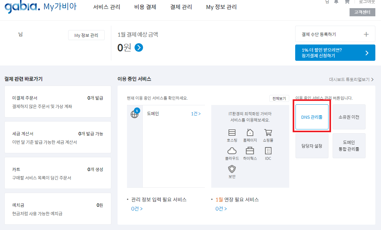 - 나같은 경우 이전에 가비아에서 구매한 500원짜리 도메인이 있었기 때문에 이 도메인을 활용했다.