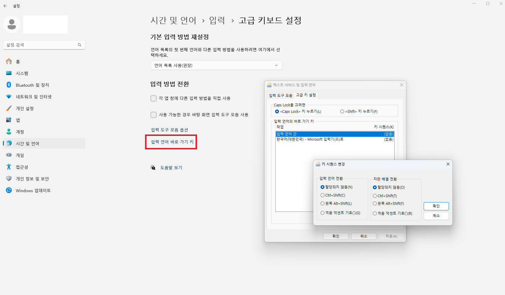 - 만약 입력 방법 전환 섹션의 각 앱 창에 다른 입력 방법을 직접 사용 체크가 되어있다면 해제 해줘야 한다.