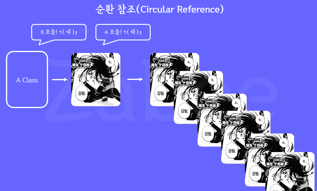 ClassA 호출 -> ClassA 안의 ClassB 호출 -> ClassB 안의 ClassA 호출 -> ClassA 안의 ClassB 호출 -> ....
