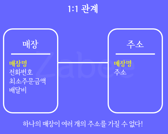 하나의 매장 이름은 하나의 주소만 가져야 한다. 배달어플을 사용하는 사람에게 있어서 이 정보는 혼동을 일으켜서는 안 되니까. 그렇기 때문에 하나의 주소에 여러 개의 매장이 등록되면 안 되고, 하나의 매장이 여러 개의 주소를 가지면 안 된다.