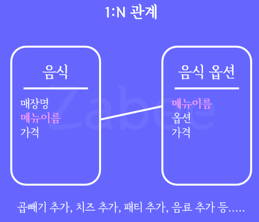 이 경우 일대다 관계로 설계한다면, 옵션을 먼저 등록하기 위한 쟁탈전이 일어날 것이다. 이 옵션에 등록할 수 있는 음식은 단 하나뿐이니까.