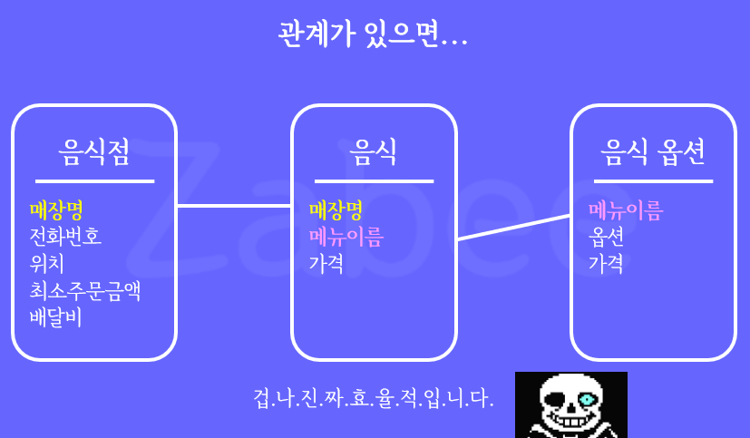관계는 데이터베이스에서 컬럼의 비어있는 데이터 공간을 최소화하기 위한 수단이다. 무슨 말이지 감이 잘 안 올 수도 있다. 그래서 먼저 관계가 없으면 어떤 사태가 일어나는지를 음식점의 음식으로 예를 들어보자.
