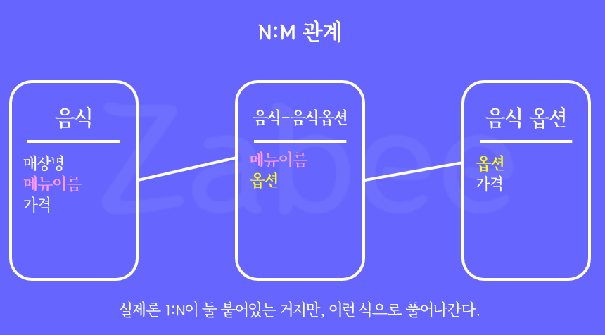 이럴 때 여러 개의 음식과 여러 개의 옵션이 상호 참조할 수 있도록 설정해 주는 것이 다대다 관계이다.