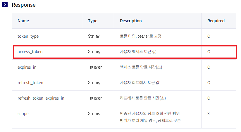 요청한 데이터를 응답받았으면, 이 응답받은 데이터 속에서 액세스 토큰을 끄집어내야 한다. 근데 액세스 토큰은 파라미터가 어떻게 돼요? 힌트는 위의 사진에도 있다. 정답은 공식문서에 있다!