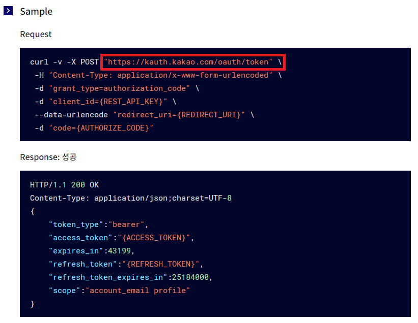 빨간 박스 쳐진 주소로 POST 방식으로 요청을 보내면 되는 것이다. 오케이 좋았어.