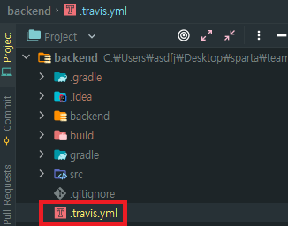 이제 본격적인 세팅에 들어간다. 처음엔 .travis.yml 파일을 만들어줘야 한다. 생성 위치는 build.gradle이 존재하는 곳과 같은 레벨의 디렉터리에 생성하면 된다. 최상위라는 뜻이다.