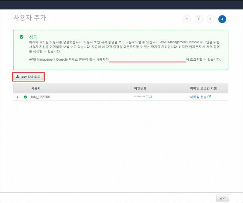 만들고나서 정말 중요한 건, CSV 다운로드 반드시 해줘야한다. 이후 작업 액세스에 쓰이는 키값들이 보관되어있는 파일인데, 사용자 생성시에만 다운로드 받을 수 있으므로 지금 못 받아놓으면 사용자 다시 만들어야 한다. 귀찮다.