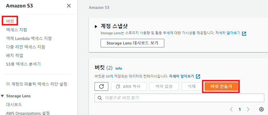 AWS에서 S3를 검색하고 해당 페이지로 이동한다.