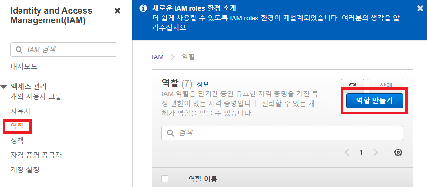 AWS에 IAM 검색 -> 역할 진입