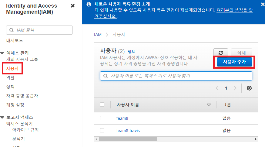 가장 먼저 해줘야 하는 일은 배포 작업을 수행해줄 사용자를 만드는 것이다. 사용자를 만드는 작업은 AWS IAM에서 수행한다.